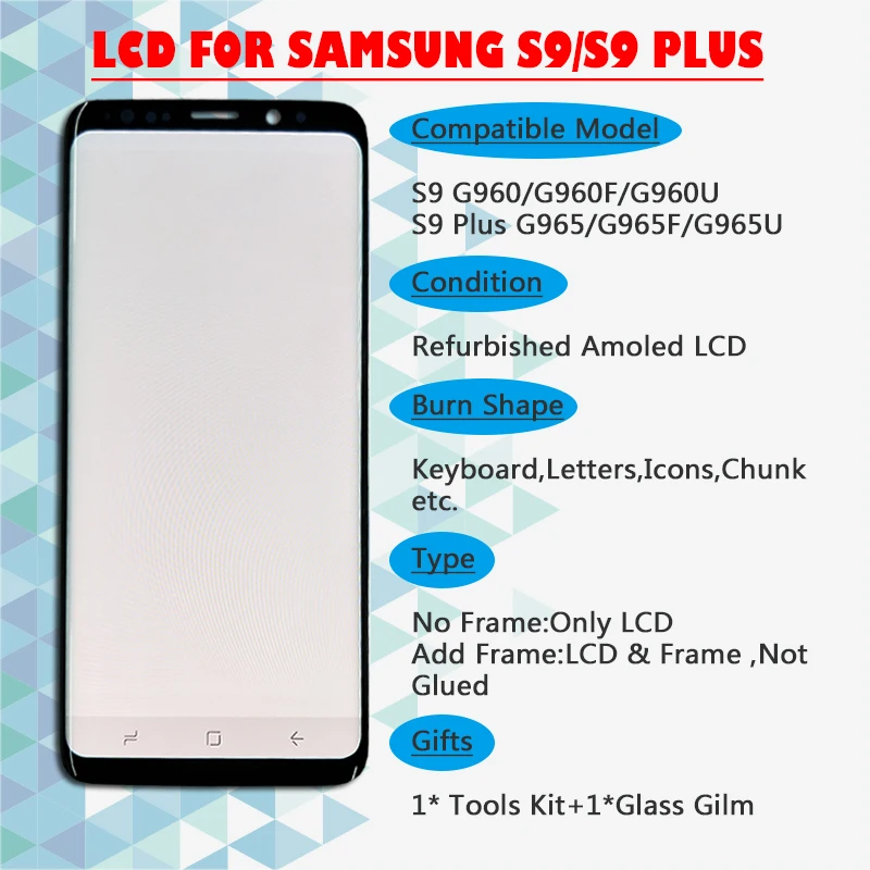 - Product name : ORIGINAL AMOLED lcds Replacement for SAMSUNG Galaxy S9 S9+LCD Touch Screen Digitizer with Frame G96